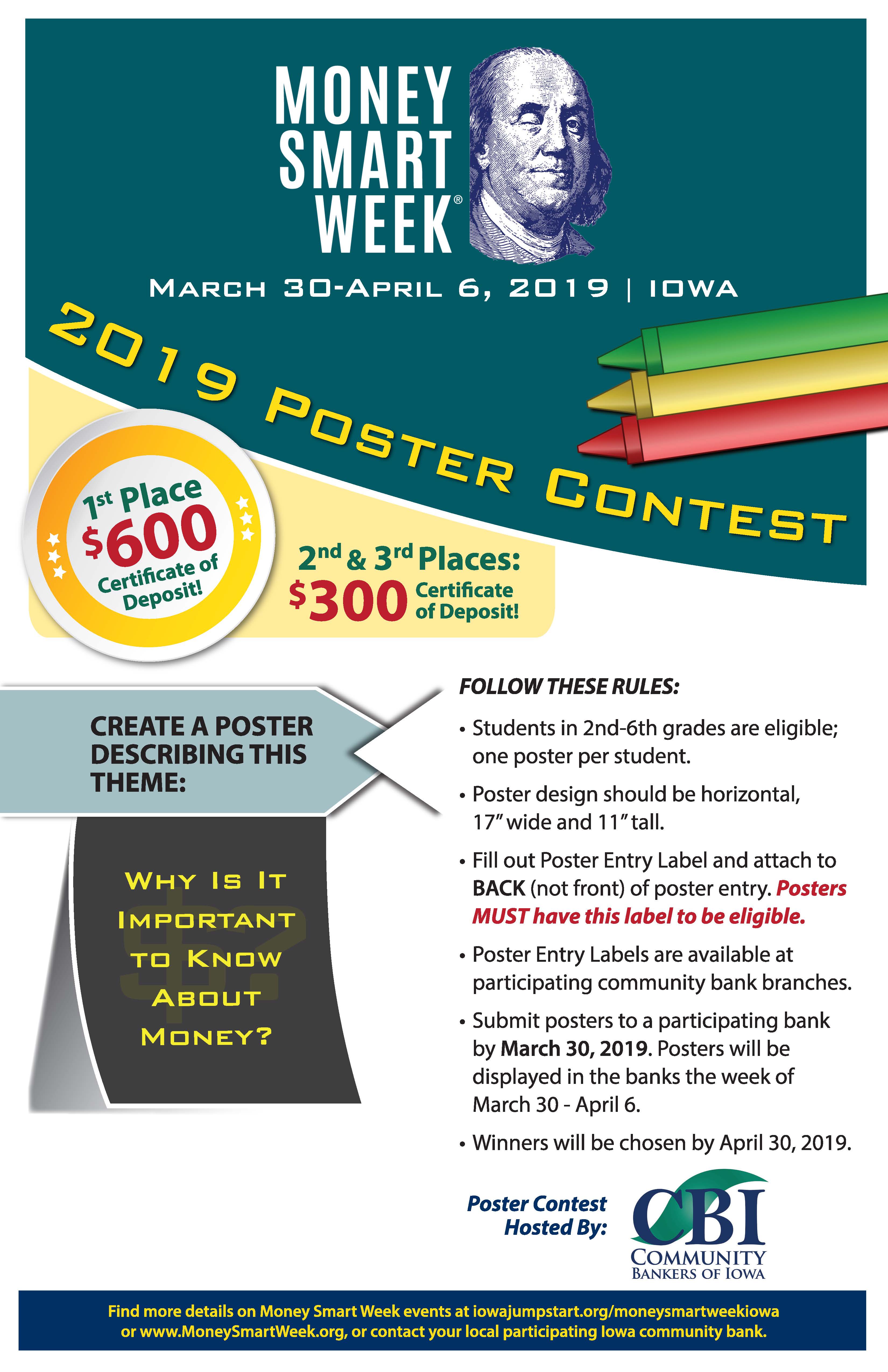 A fantastic part of Money Smart Week that is coming up in April is the Poster Contest sponsored by Community Bankers of Iowa. The contest is for 2nd-6th grade students. It is fun for the creative kids to try to make some money with their art. Please go to this website for all the details.