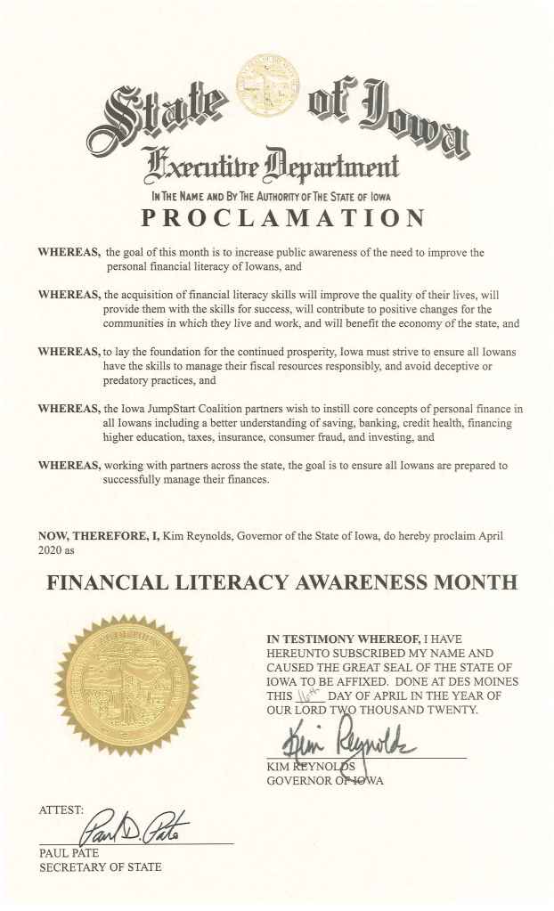 On April 16th, Governor Kim Reynolds signed a proclamation to declare April Financial Literacy Awareness Month. We are living in an epic time. Through all of life’s changes and struggles we now face, let us focus on how to use our finances to better our lives and stretch our resources to the unknowable end. Iowa Jump$tart Coalition is dedicated to providing resources to promote financial literacy education. Please explore our website or contact us for more information.