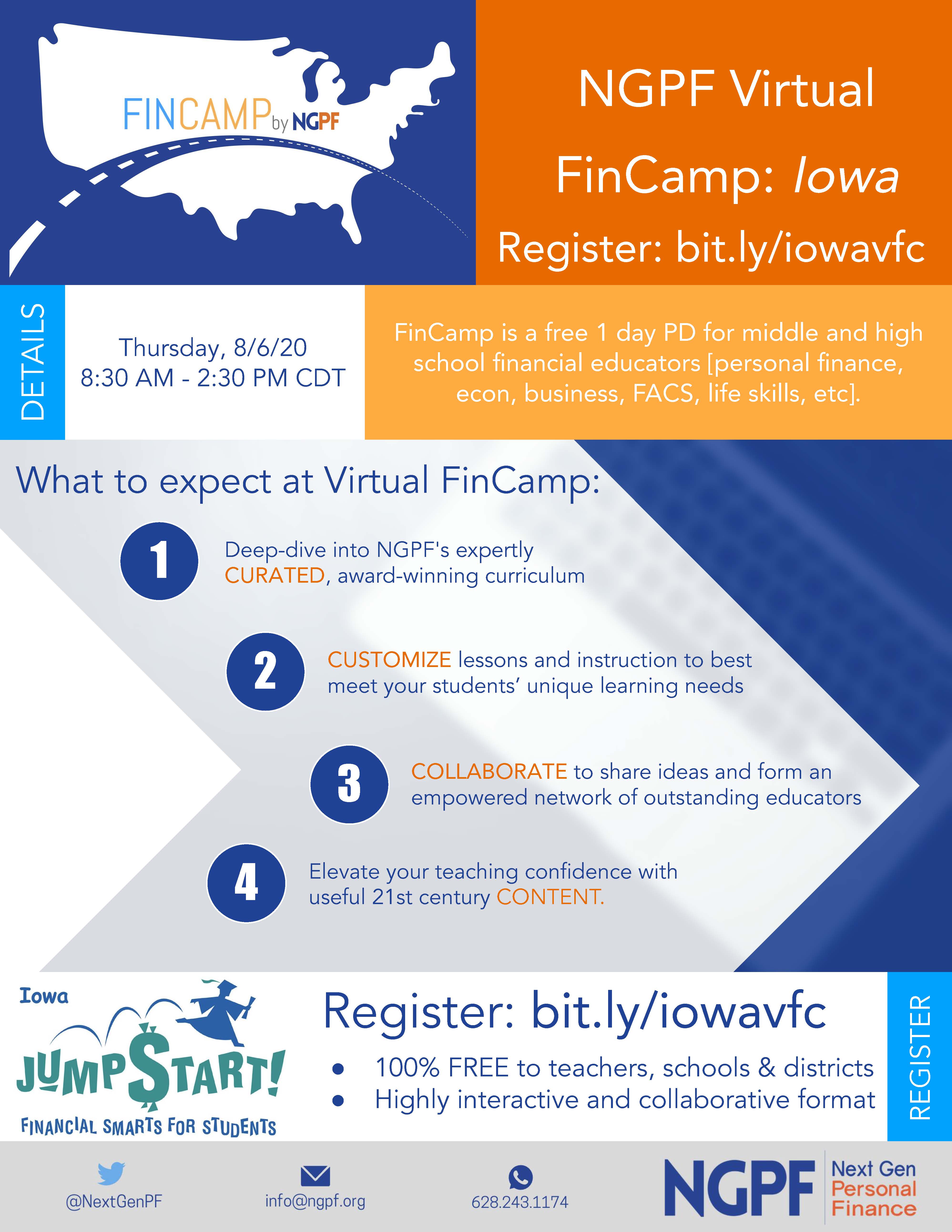 We are excited to announce that Iowa Jump$tart has coordinated with Next Gen Personal Finance to offer a one-day virtual workshop for Iowa teachers on Thursday, August 6. The focus of this workshop will be on how to deliver great and effective financial literacy content virtually.