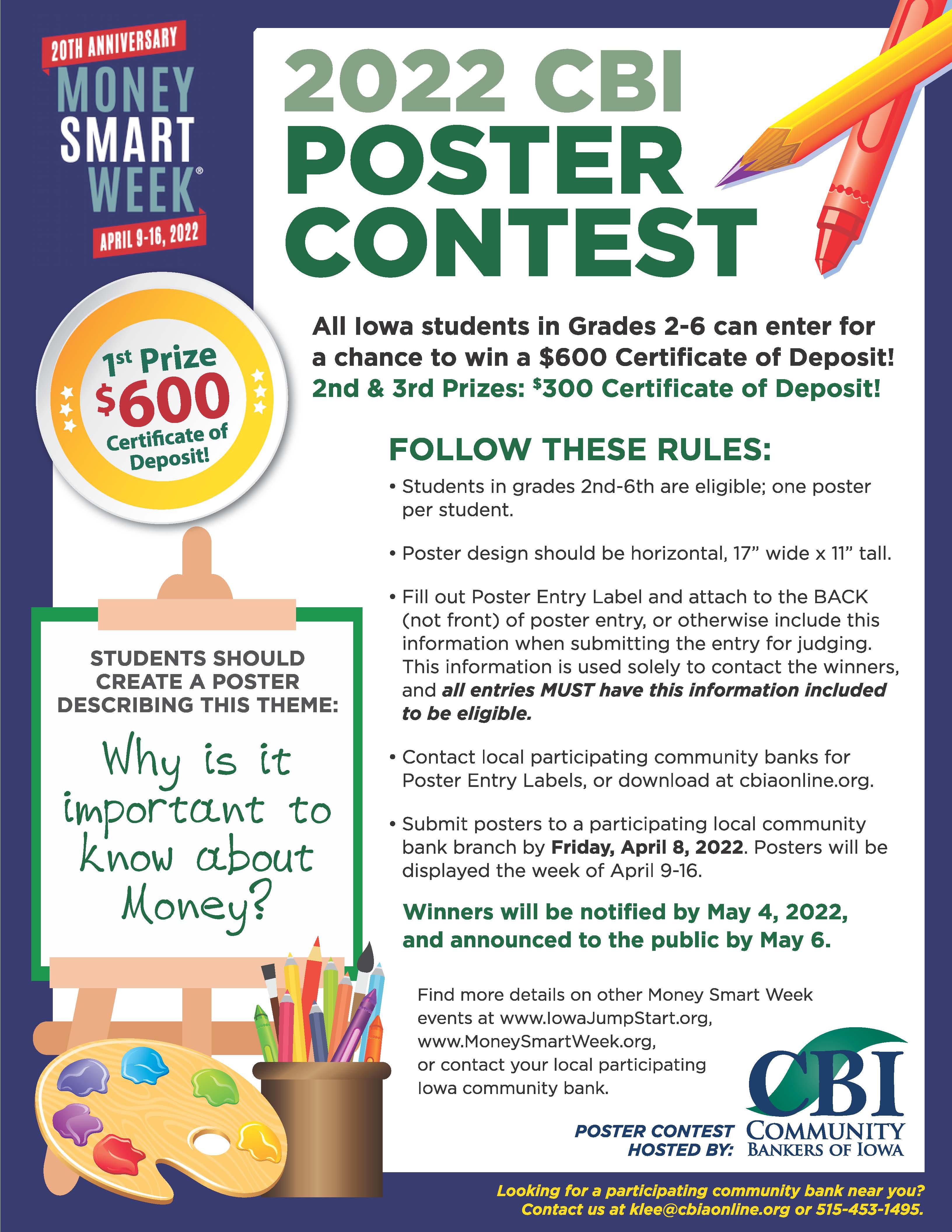 Participating elementary students should submit their poster designs to participating community bank branches throughout Iowa by April 8, 2022. Posters will be displayed in the banks throughout Virtual Money Smart Week (April 9-16, 2022). Contest winners will be chosen and notified by May 4, 2022, and announced to the public by May 6. Complete rules & submission guidelines are available at www.cbiaonline.org. Contact the CBI office at 515-453-1495 or klee@cbiaonline.org for assistance in locating a participating community bank near you.