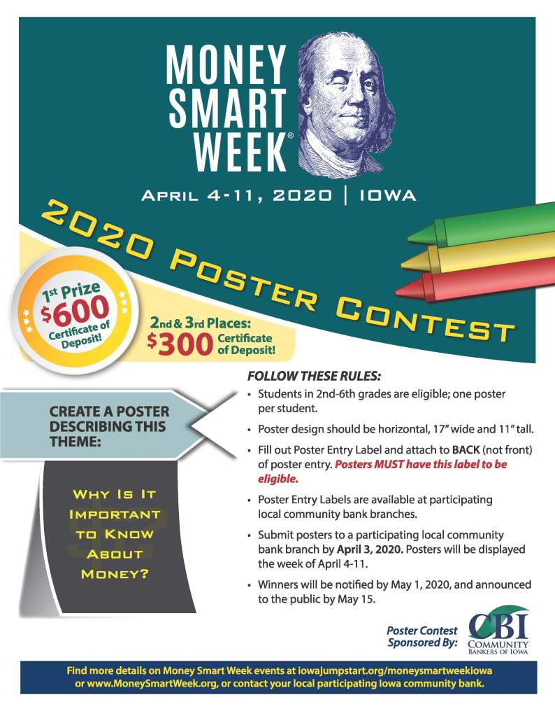 The 2023 Money Smart Week Poster Contest is officially open! Since 1999, Community Bankers of Iowa has sponsored the Money Smart Week Poster Contest as part of April’s Community Banking Month festivities.