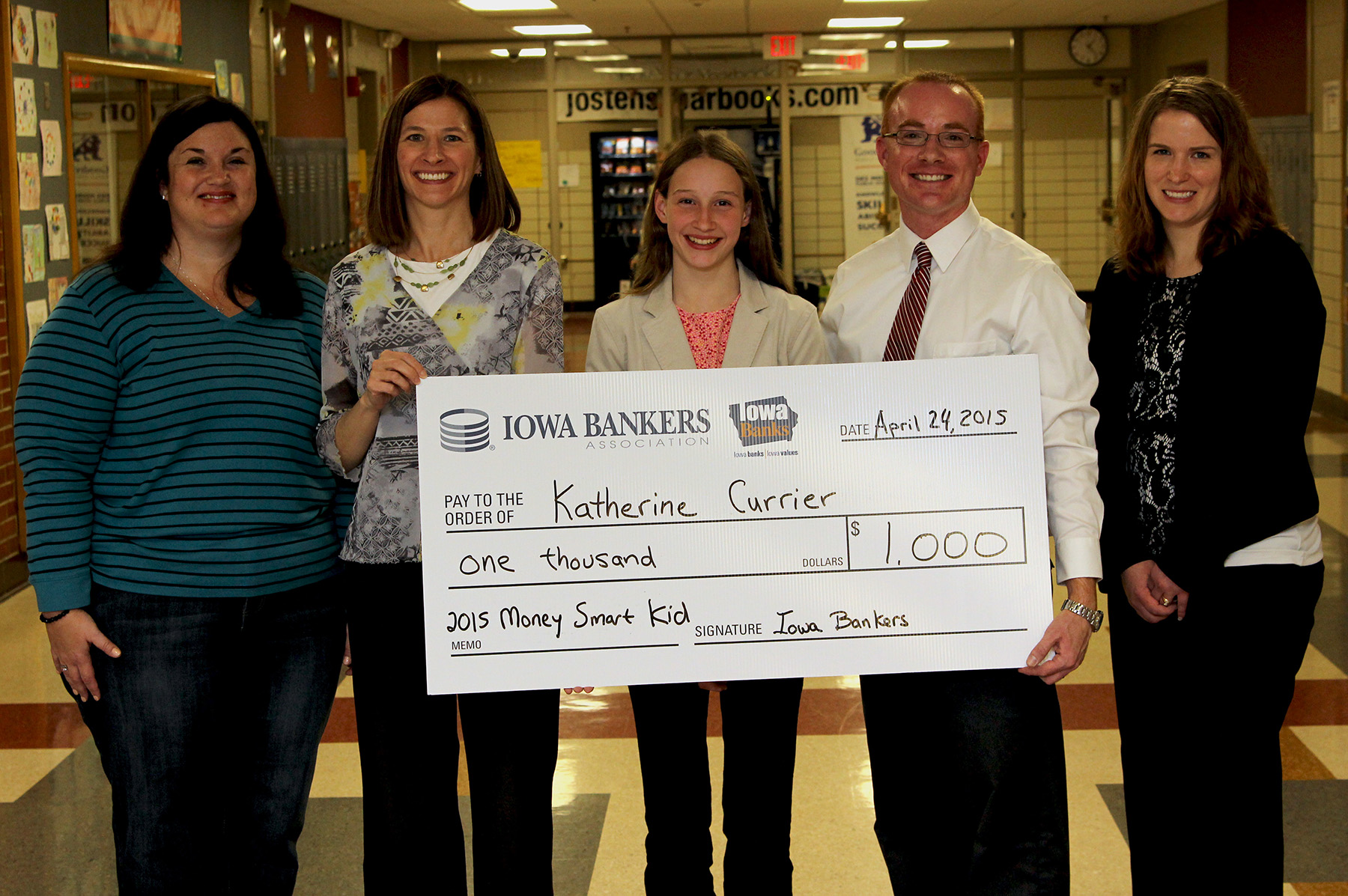 Katherine Currier, an eighth grader at Goodrell Middle School, has won the statewide financial literacy essay contest for Money Smart Week Iowa and has been named Iowa’s 2015 Money Smart Kid. Currier was recognized April 24 at Goodrell Middle School. Currier will also receive a $1,000 Certificate of Deposit sponsored by the Iowa Bankers Association.